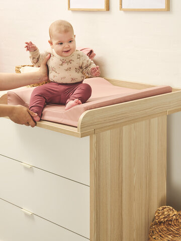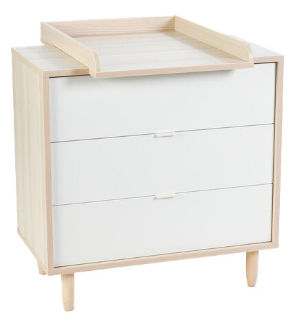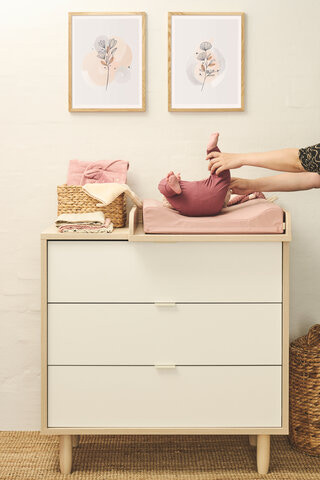 Bytestund: Ett enkelt och robust skötbord med tre praktiska lådor, som ger perfekt förvaringsutrymme för allt du behöver ha nära till hands när det är dags att byta på ditt barn. Ramen har en attraktiv trälook, vilket ger hela byrån en vacker design. När bytestunden är över kan skötbordsskivan enkelt tas bort, så att du får en byrå till barnrummet.