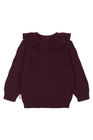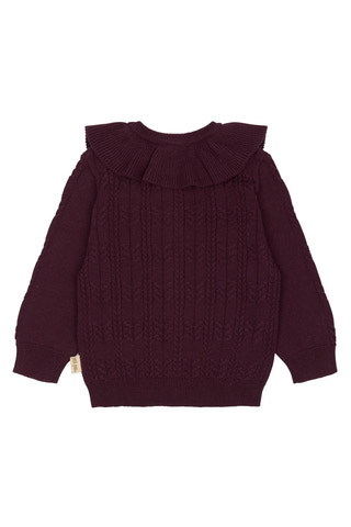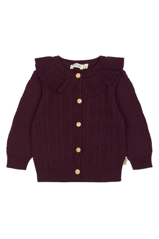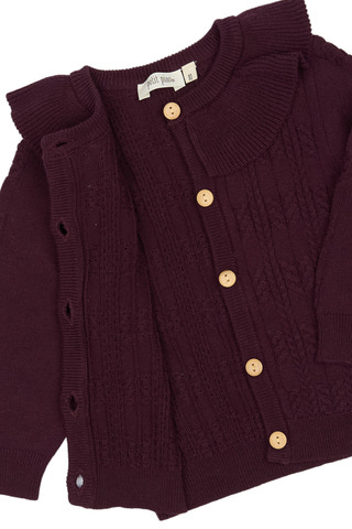 Denna fina cardigan från Petit Piao är stickad med ett elegant mönster och har många vackra detaljer. Runt halsen pryds den av delikata volanger som ger en feminin touch. Koftan stängs med dekorativa knappar i naturligt trä och alla kanter är avslutade med breda ribbkanter som ger en snygg och hållbar finish. Den är tillverkad i en mjuk och kraftig bomullsstickning som både känns skön och håller formen väl.