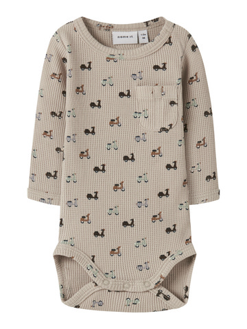 Fräscha upp ditt barns garderob med mjuka och praktiska bodys som passar perfekt året om. Våffelstickningen kännetecknas av sin distinkta yta med små rektanglar som ger en cool struktur. - Produkttyp: Body - Halsringning: Rund hals - Ärm: Långa ärmar (L/S) - Stängning: Tryckknappar - Fickor: Ficka fram - Varning: VARNING! Hålls borta från eld