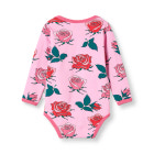 Långärmad babybody med rosor, tillverkad av ekologisk, stretchig bomullsjersey. Denna body är OEKO-TEX Standard 100®-certifierad, vilket innebär att den har tillverkats och testats för skadliga ämnen, så att du kan skydda ditt barns hud och hälsa. Bodyn har en normal passform med kuvertknäppning och tryckknappar samt ribbade kanter vid halsen och ärmarna. Småfolks bodys är designade i Danmark med avsikten att tåla otaliga äventyr och lek, samtidigt som de behåller sin form och färg även efter upprepad användning. Modellen på bilden är 79 cm lång och bär storlek 80 cm.
