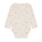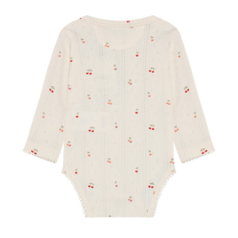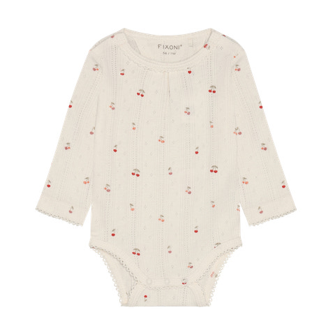 Fixonis långärmade bodysuit i pointelle är ett utmärkt val för de allra minsta. Den mjuka pointelle-stickningen känns skön mot barnets hud och ger god rörelsefrihet. Med sitt fina körsbärsmönster och små detaljer har bodysuiten en söt och klassisk look som passar både till vardags och till fest. De långa ärmarna ger extra värme och de praktiska tryckknapparna i nederkanten gör det enkelt att byta blöja. Bodyn är designad med fokus på komfort och funktionalitet, så att både barn och föräldrar får en bra upplevelse. Fixoni är känt för sin höga kvalitet och mjuka material, vilket gör denna bodyn till ett säkert val för din garderob.