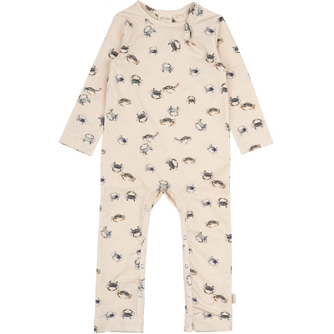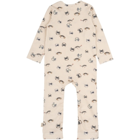 Långärmad jumpsuit med akvarellmönster från Petit Piao i ekologisk bomull. Mönstren är inspirerade av naturen och allt som finns längs Jyllands västkust. Mönstren har en krämfärgad bakgrund, så att mönstret kommer i fokus. På vänster sida av halsringningen finns ett tryckknapp som gör det enkelt att ta på jumpsuiten över barnets huvud. Det finns tryckknappar nästan hela vägen runt benöppningarna, vilket gör det enkelt att ta av jumpsuiten. Den innehåller 5 % elastan, vilket gör att ditt barn kan röra sig och leka obehindrat. Jumpsuiten är tillverkad i Indien.
