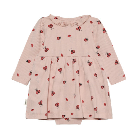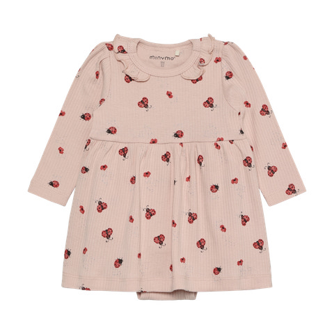Den långärmade ribbade bodysuitklänningen med tryck från Minymo i färgen Peach Whip är ett underbart val för de små. Klänningen kombinerar bodysuitens praktiska egenskaper med en klännings eleganta utseende, så att ditt barn både är bekvämt klätt och snyggt. Det mjuka ribbade tyget ger god rörelsefrihet och det söta nyckelpigetrycket ger en charmig och lekfull look. Tryckknapparna vid axeln och nederkanten gör det enkelt att klä på och av ditt barn, vilket är en stor fördel i vardagen. Klänningen är idealisk för både lek och mys och kan enkelt stylas med strumpbyxor eller leggings för en komplett outfit.