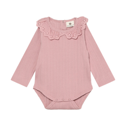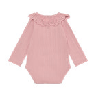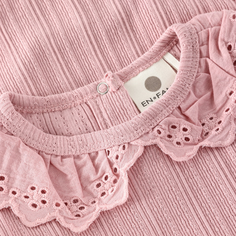 Den långärmade Pointelle Bodysuit från En Fant är ett utmärkt val både för vardagsbruk och festliga tillfällen. Bodysuiten är tillverkad i ett mjukt och stretchigt tyg som garanterar maximal komfort för ditt barn hela dagen lång. Den fina pointelle-strukturen ger den ett elegant och feminint utseende, medan den dekorativa kragen med broderade detaljer tillför en extra touch av charm. Bodyn har långa ärmar som håller ditt barn varmt, och de praktiska tryckknapparna i nederkanten gör det snabbt och enkelt att byta blöja. Halsringningen är utformad med en liten knapp bak i nacken, vilket gör det enkelt att dra bodyn över huvudet.