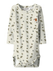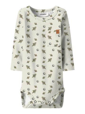 Layo Geo långärmad bodysuit från Lil' Atelier i färgen Turtledove är ett underbart val för de små. Bodysuiten har ett charmigt tryck med raketer och planeter, vilket gör den extra rolig och mysig. Den mjuka kvaliteten garanterar komfort hela dagen, och de långa ärmarna ger värme på kyliga dagar. Tryckknappar i nederkanten gör det enkelt att byta blöja, och den lilla bröstfickan med etikett ger en fin, unik touch. Perfekt för både vardagsbruk och lek, så att ditt barn kan röra sig fritt och bekvämt.