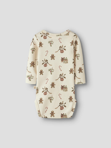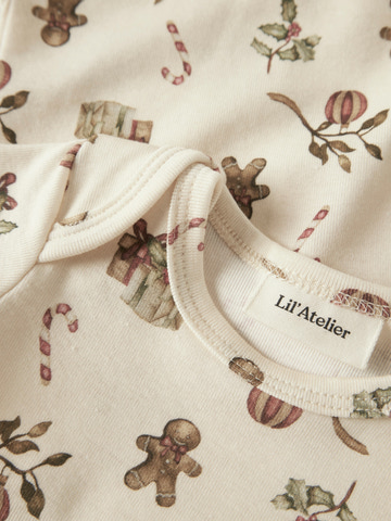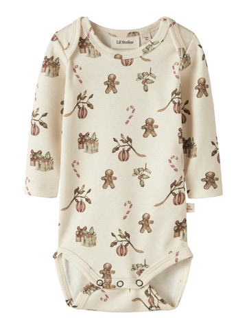 Layo Gis Langærmet Body fra Lil' Atelier er et skønt valg til de mindste, når komfort og stil skal gå hånd i hånd. Bodyen er fremstillet i et blødt og strækbart materiale, der føles behageligt mod barnets hud og giver god bevægelsesfrihed. Det fine print med julemotiver som peberkagemænd, gaver og slikstokke gør bodyen ekstra festlig og oplagt til hyggelige decemberdage. Med de praktiske trykknapper i bunden er det nemt at skifte ble, og den klassiske turtledove-farve passer til både hverdag og fest. Bodyen har en god pasform og er ideel som basislag under andet tøj eller alene på varmere dage.
