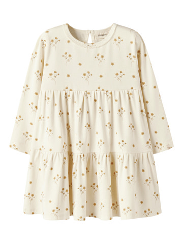 Layo Sif Klänning från Lil' Atelier är en charmig och tidlös klänning i färgen Coconut Milk, dekorerad med ett vackert blommönster. Klänningen är tillverkad i mjuk bomull som känns skön mot huden och har en långärmad design som passar perfekt för svalare dagar. Den har en fin volangkjol och en praktisk knapp i nacken som gör det enkelt att ta av och på plagget. Klänningen är lika fin till vardags som till festliga tillfällen och ger en klassisk look till ditt barn. Den är lätt att matcha med strumpbyxor eller leggings för en komplett outfit.