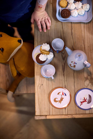 Teservisen förvaras snyggt i den medföljande kartongväskan med metallhandtag och gångjärn, som kombinerar funktionalitet och charm. Väskan håller allt organiserat när det inte används och gör det enkelt att ta med leksakerna på äventyr. Setet innehåller allt som behövs för den perfekta tebjudningen: 4 tekoppar, 4 fat, 4 tårtfat, 1 tekanna och 1 serveringsbricka. Setet är dekorerat med vackra illustrationer och färger.