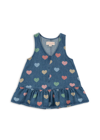 Jeanskjol i mjuk och slitstark ekologisk bomull med V-ringning fram och en smickrande kjol med volanger nederst.