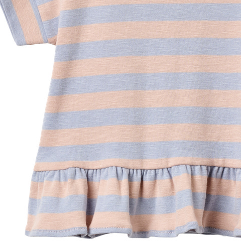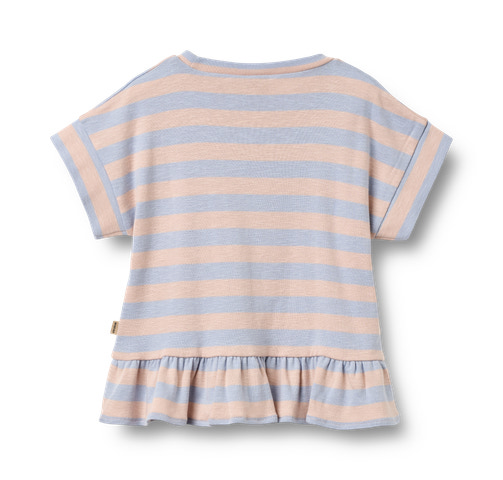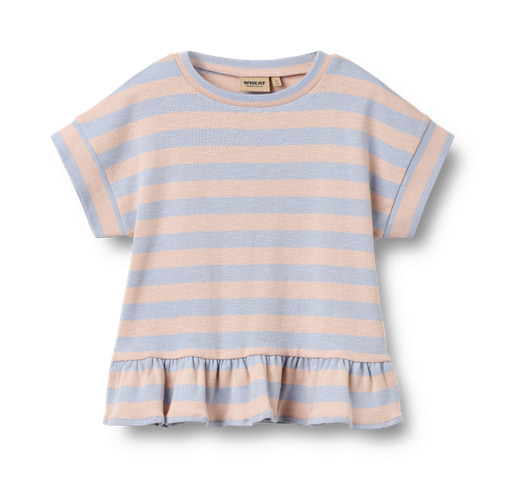 Marie T-Shirt från Wheat är en charmig och bekväm t-shirt för barn, tillverkad i mjuk ekologisk bomull som är snäll mot både huden och miljön. Den har ett klassiskt randigt mönster i ljusblått och puderrosa, vilket ger ett fräscht och lekfullt intryck. Volangdetaljen nedtill adderar en extra touch av sötma och gör t-shirten till ett härligt plagg för både vardag och festliga tillfällen. Med sin avslappnade passform och korta ärmar är den enkel att bära och passar utmärkt till både jeans, shorts och kjol. Ett hållbart val för den medvetna familjen!