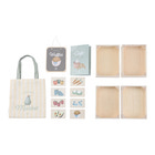 Tygskärmen skapar en autentisk marknadsatmosfär, och med tavlan och illustrerade kort kan de visa upp sina produkter på ett vackert sätt. Setet innehåller även en shoppingkasse och lådor för en äkta shoppingupplevelse. Vänd på marknadsståndet så blir det ett café med meny och glada illustrationer. Kombinera det med kassaapparat, våg eller tårtställ för ännu mer lekglädje. Vad står på menyn idag?