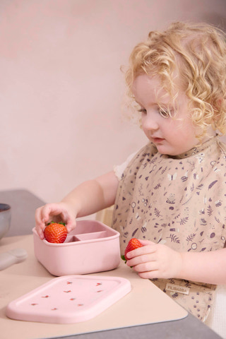 Söt och praktisk matlåda i 100% livsmedelsgodkänd silikon. Med sin storlek på 700 ml finns det gott om plats för snacks. Matlådan är indelad i 3 mindre fack, så att maten kan hållas åtskild, precis som många barn föredrar. Det flexibla locket sluter tätt, så att allt hålls på plats.