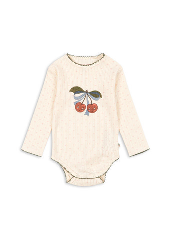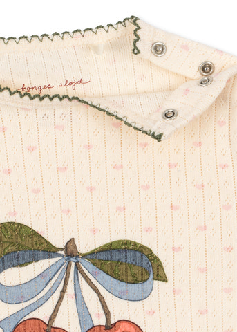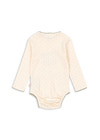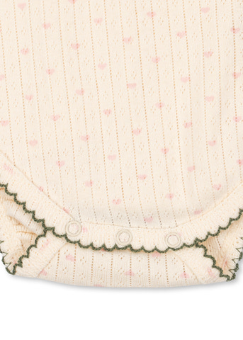 Mjuk kropp i ekologisk bomull med dekorativ pointelle. Designad med tryckknappar vid benöppningen för enkel påklädning.
