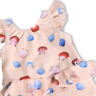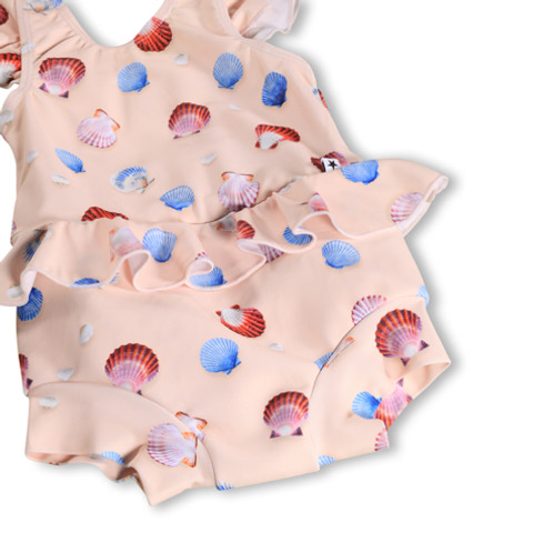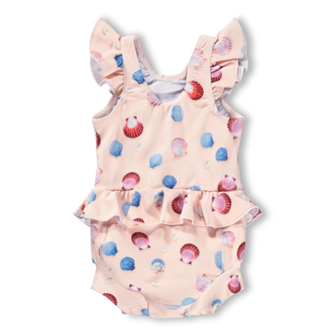 Nandini Baddräkt från Molo är en charmig och lekfull baddräkt i ljusrosa med färgglada snäckskal. De fina volangerna vid axlar och midja ger ett extra sött uttryck och gör baddräkten perfekt för både strand och pool. Materialet är mjukt, stretchigt och snabbtorkande, vilket gör den bekväm att bära hela dagen. Med inbyggt UV-skydd 50+ kan du känna dig trygg när ditt barn leker i solen. Den är lätt att ta på och av, och passar utmärkt för aktiva små badare som vill ha både stil och funktion.
