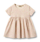 Kortärmad jerseyklänning med tryck i mjuk ekologisk bomull för barn. Wheat har söta klänningar med lös passform, vilket gör dem lätta och bekväma för ditt barn att ha på sig. Klänningen har en smickrande skärning med rynkor, vilket ger klänningen en fin volym.