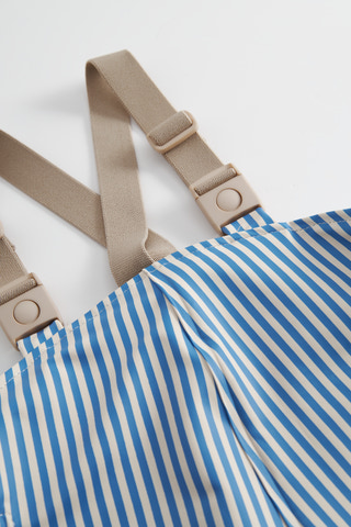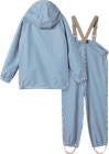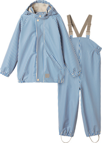 Regnkläder för barn. Regnbyxorna har hängslen och elastiska sidor för bästa passform. Jackan har en framficka och stängs med dragkedja och tryckknappar.
