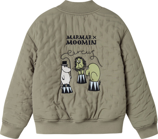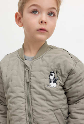 Termojacka för barn med lös passform och två ytterfickor. Termojackan stängs med dragkedja och har ett fint broderat Mumin-tryck. Termojackan är perfekt som varm och praktisk övergångsklädsel.