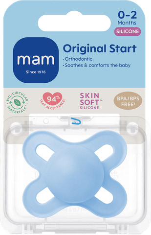 MAM Original Start är en extra liten och lätt napp som passar de minsta bebisarna. Nappen är hudvänlig tack vare stora lufthål och MAM:s unika knubbiga insida. Sugdelen är tillverkad av silkeslen silikon, MAM SkinSoftTM, som känns mjuk och bekant, precis som mammas hud, och accepteras av 94 % av alla bebisar*. MAM Start levereras i en praktisk förvarings- och steriliseringslåda, som gör det enkelt att sterilisera nappen i mikrovågsugnen.