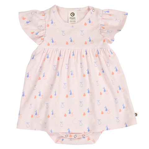 Picnic Rib Bodyklänning från Müsli är en underbar kombination av klänning och body, perfekt för både vardag och fest. Den är sydd i en mjuk ribbad kvalitet med 95% ekologisk bomull och 5% elastan, vilket ger en skön stretch och rörelsefrihet för ditt barn. Klänningen har söta volangärmar och ett lekfullt mönster i pastellfärgerna Primrose, Shell blue och Tofu. Praktiska tryckknappar på axeln och i grenen gör det enkelt att byta blöja och klä på.