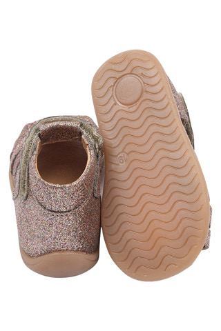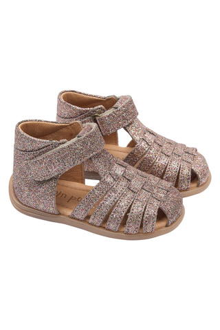 Pop Lära-gå Sandal från Pompom är en charmig och praktisk sandal för de minsta. Den är tillverkad i mjukt läder med en glittrande rose-finish som gör varje steg extra roligt. Den flexibla gummisulan ger bra grepp och stöd, vilket är viktigt för barn som just har börjat gå. Sandalen har en justerbar kardborre som gör det enkelt att ta av och på, och den öppna designen ger god ventilation under varma dagar. Perfekt för både lek och vardag, och den mjuka insidan gör att sandalen sitter bekvämt hela dagen.