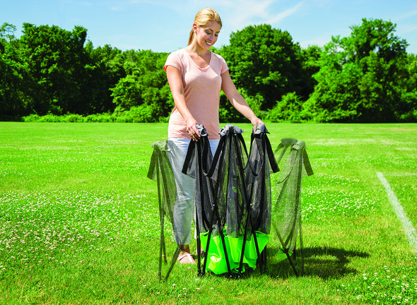 Kompakt hopfällbar design inkluderar en resväska med rem för enkel transport.
