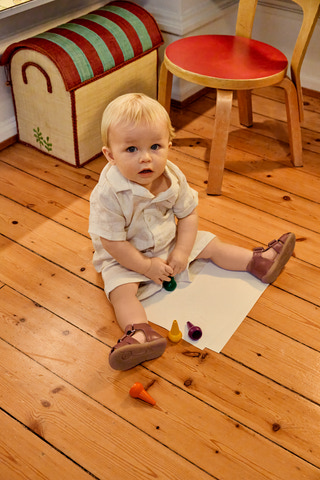 Angulus Beginner Sandal med kardborreband i Cognac/Cognac är den perfekta första sandalen för små fötter som är redo för äventyr. Sandalen är designad med fokus på komfort och stöd, vilket ger ditt barn den bästa starten på sin gångutveckling. Den mjuka och flexibla gummisulan ger god rörlighet och stabilitet, medan det naturliga lädret säkerställer ett hälsosamt fotklimat. Sandalen har två praktiska kardborreband som gör det enkelt att justera passformen och ta på och av sandalen – även för de allra minsta. Den täckta tån skyddar små tår, och den öppna hälen och sidorna ger god ventilation under varma dagar. Angulus är känt för sin höga kvalitet och klassiska design, och denna sandal är inget undantag. Perfekt för både vardagslek och speciella tillfällen där komfort och stil går hand i hand.