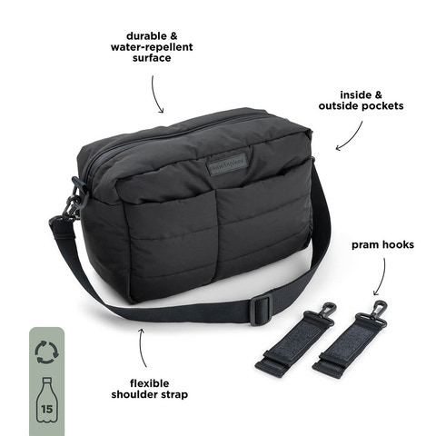 • Slitstark och vattenavvisande yta • Flexibel axelrem och barnvagnskrokar ingår • Ett stort fack med tre innerfickor och två ytterfickor • Tillverkad av återvunnen polyester från 15 använda PET-flaskor
