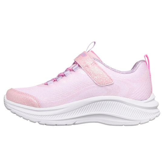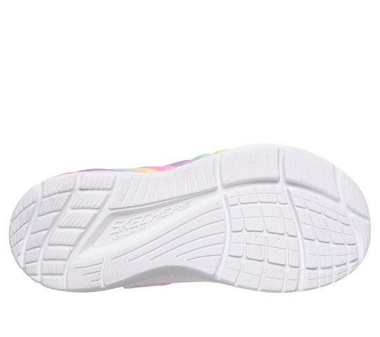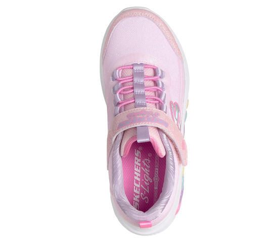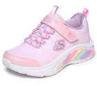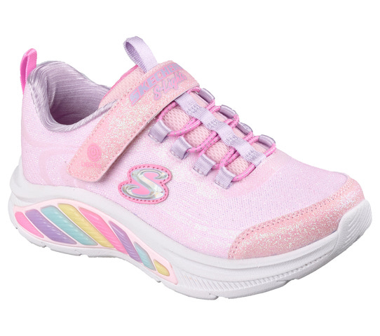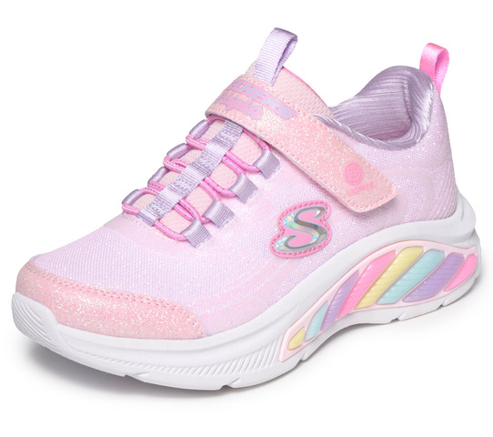 SKECHERS Rainbow Cruisers - Pink är en lekfull och bekväm sko som passar perfekt för aktiva barn. Skon har en mjuk textilovandel med glittrande finish och regnbågsfärgade detaljer på sidan, vilket gör den extra rolig att bära. Den praktiska kardborreknäppningen och elastiska snörningen gör det enkelt för barnet att ta på och av skon själv. Den stötdämpande mellansulan ger skön komfort hela dagen, och den halksäkra yttersulan ger bra grepp på olika underlag. Perfekt för både skola och fritid, och ett färgglatt tillskott till garderoben!