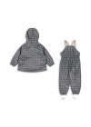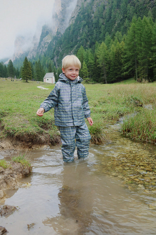 Vindtät och vattentät PU-regnkläder med varmt fleecefoder. Med viktiga detaljer som avtagbar huva med foder, elastiska muddar och svetsade sömmar som garanterar fullständigt skydd mot väder och vind. Observera: Regnbyxor upp till storlek 4 år har hängslen. Från storlek 5–6 år har regnbyxorna resår i midjan, vilket gör dem lätta att ta på och av.