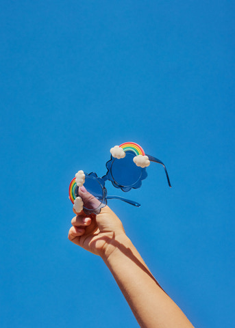 Regnbåge Solglasögon - Sparkling Sea från Molo är ett par solglasögon som verkligen sticker ut! Med sin fantasifulla regnbågs- och molndesign blir de snabbt en favorit hos alla barn som älskar färg och lek. Glasögonen är tillverkade i slitstark polykarbonat, vilket gör dem både lätta och tåliga för lekfulla dagar utomhus. De blåtonade linserna ger ett effektivt UV-skydd för ögonen, så att ditt barn kan vistas i solen på ett säkert sätt. Perfekta för både stranden, parken och vardagens äventyr – och dessutom riktigt bekväma att bära hela dagen!