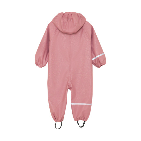 Regnkläder i PU från CeLaVi. Regnkläderna är enfärgade med glittertryck. Det finns smala reflekterande ränder runt ena armen och ett ben. Logotypen är tryckt med reflekterande bläck längst upp på ena armen och på baksidan av huvan. CeLaVi-regnkläderna har en avtagbar huva som fästs med tryckknappar i kragen. Den stängs framtill med en vattentät dragkedja. Ansiktsöppningen på huvan, ärmarna och midjan har resår för bättre passform. Byxorna har praktiska och justerbara elastiska band som kan dras under skorna. Certifierad enligt GRS – Tillverkad av 66 % återvunnet material CERES-0366