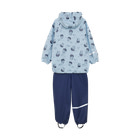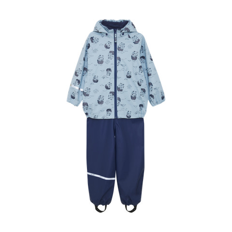 Praktiskt regnklädeset i PU från CeLaVi. Setet består av en jacka med heltäckande tryck och en enfärgad underdel. Byxorna har justerbara hängslen och klickknappar upp till storlek 110, därefter är de utan hängslen. Byxorna har praktiska och justerbara elastiska band som kan dras under skorna. Jackan stängs med dragkedja. Det finns smala reflekterande ränder runt ena armen och ett ben. Logotypen är tryckt med reflekterande bläck längst upp på ena armen och på baksidan av huvan. CeLaVi-regnjackan har en avtagbar huva som fästs med tryckknappar. Öppningen för ansiktet på huvan, ärmarna och midjan har resår för bättre passform. Jackan har en vattentryck på 10 000 mm.