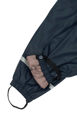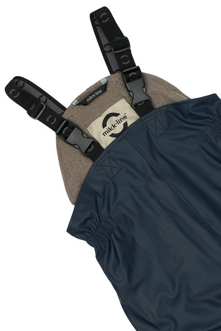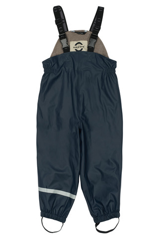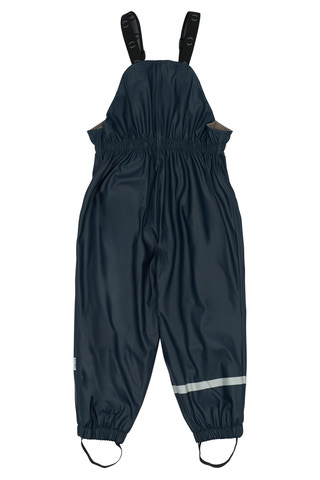 Storlek 86–104: regnbyxor med hängsle och hög midja för att skydda mage och rygg. Justerbara hängslen med klickspännen