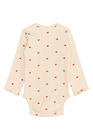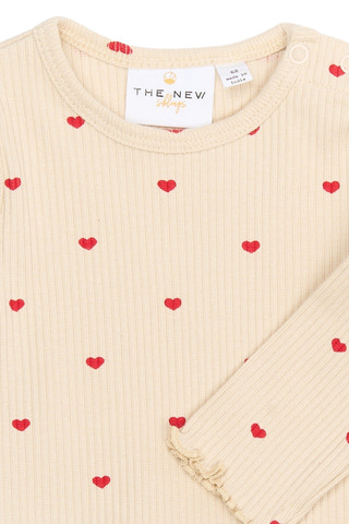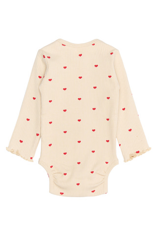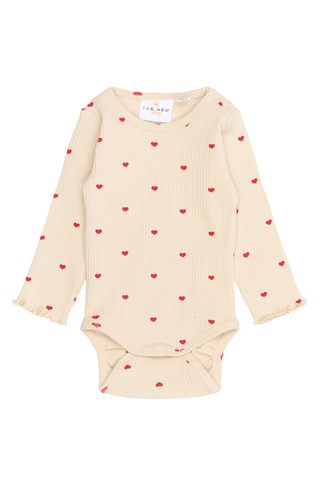 Denna långärmade body från THE NEW Siblings är både söt och funktionell – perfekt för de allra minsta. Den har ett heltäckande tryck med små hjärtan och fina fransade ärmslut, vilket skapar en charmig och lekfull look. Bodyn stängs med tryckknappar på axeln och nedtill, vilket gör den lätt att ta av och på. Perfekt för både vardagsbruk och mysiga stunder.