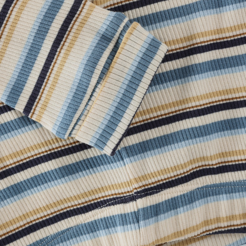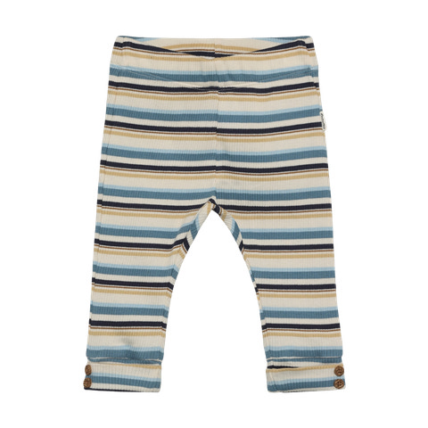 Dessa ribbade byxor med ränder från Minymo i Moonstone är ett utmärkt val för både vardagsbruk och lek. Byxorna är tillverkade av ett mjukt och stretchigt ribbat tyg som garanterar rörelsefrihet och komfort för ditt barn. De fina ränderna i blått, beige och mörka toner ger en modern och fräsch look, medan de små knapparna vid benen tillför en charmig och unik touch. Den elastiska midjan gör byxorna lätta att ta på och av och ser till att de sitter på plats hela dagen. Perfekta för både små och större barn som älskar att vara aktiva och ha det bekvämt.