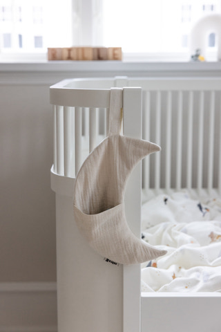 Sebras sängficka, moon, är en söt och funktionell förvaringslösning för barnrummet. Den mjuka måneformade fickan gör det enkelt att hålla reda på de små saker som ditt barn behöver vid läggdags – till exempel napp, snuttefilt eller favoritbok. Med sin praktiska rem kan fickan enkelt hängas på spjälsängen, så att allt finns inom räckhåll. Den stilrena och lugna designen passar in i de flesta inredningar och skapar en mysig atmosfär runt sovplatsen. Sebra är känt för sin kvalitet och estetik, och denna sängficka är inget undantag – den är både dekorativ och funktionell.