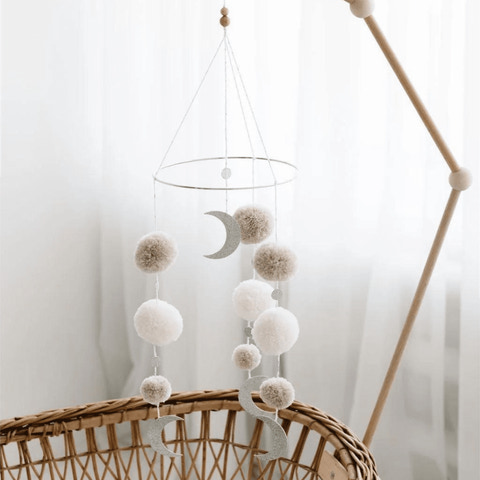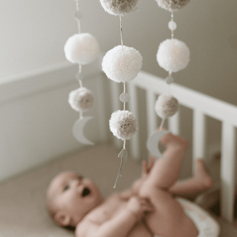 En vacker kombination av handgjorda ullpomponer och glänsande detaljer väcker ditt barns fascination för former och färger. Neutrala och pastellfärgade toner ger en delikat inredning till ditt barns rum.