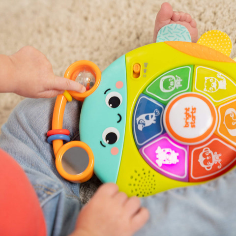 Bright Starts Safari Surprise multisensoriska aktivitetsleksak är en spännande lekkamrat designad för att stimulera bebisens syn, hörsel och känsel. Med en knapptryckning öppnar sig en värld av färgstark, djurinspirerad inlärning och utveckling: hör djurens namn, ljud och sånger, se djurhjulet lysa upp, känn på de texturerade remmarna och titta i spegeln efter självupptäckt. Den medföljande pärlbanan och 3-ringsreglagen ger extra underhållning och hjälper barnet att stärka finmotoriken. Inkluderar hög och låg volyminställningar för justerbar volym.