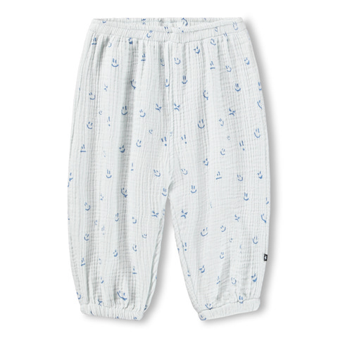 Serene-byxorna från Molo är ett utmärkt val för små barn som vill ha komfort och rörelsefrihet i vardagen. Byxorna är tillverkade av mjuk bomull som känns skön mot huden och gör att ditt barn kan leka fritt hela dagen. Det fina trycket med små blåa leende ansikten ger en lekfull och modern look som passar både till vardags och fest. Elastik i midjan och vid anklarna gör att byxorna sitter bra utan att vara för åtsittande, och det lätta materialet gör dem perfekta för både varma och svala dagar. Molo är känt för sina kreativa designs och höga kvalitet, vilket gör dessa byxor till ett säkert val för din garderob.