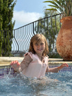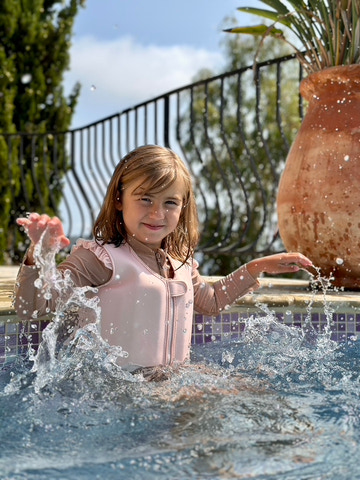 Simväst - English Rose från Vanilla COPENHAGEN är en charmig och praktisk simväst för barn som vill känna sig trygga i vattnet. Den är tillverkad i mjuk neopren och polyester, vilket gör den bekväm att bära och ger god rörelsefrihet. Västen har en söt rosa färg med fina volangdetaljer vid axlar och nederkant, vilket gör den extra rolig att använda. Med dragkedja och kardborre framtill är den enkel att ta på och av, och den ger extra flytkraft när barnet övar på att simma eller leker i poolen. Simvästen är ett utmärkt hjälpmedel för att skapa positiva och säkra vattenupplevelser för de minsta.