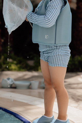 Simvästen med rem från Vanilla COPENHAGEN är ett utmärkt val för barn som ska lära sig simma eller vistas vid vatten. Västen är designad för att ge maximal rörelsefrihet samtidigt som den håller barnet säkert flytande. Den justerbara remmen mellan benen ser till att västen sitter ordentligt på plats och förhindrar att den glider upp. Materialet är både mjukt och slitstarkt, vilket gör västen bekväm att bära under längre stunder. Dragkedjan och kardborrebandet gör det enkelt att ta på och av västen, och den stilrena blå färgen passar både pojkar och flickor. Perfekt för poolen, stranden eller semestern!