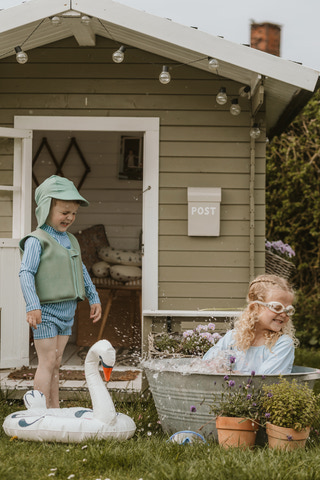 Simvästen med rem från Vanilla COPENHAGEN är ett perfekt hjälpmedel för barn som ska lära sig simma och känna sig trygga i vattnet. Den är tillverkad i mjuk neopren och polyester, vilket gör den både bekväm och slitstark. Den ergonomiska designen ger barnet full rörelsefrihet, samtidigt som den justerbara remmen mellan benen ser till att västen sitter säkert på plats. Dragkedjan framtill gör det enkelt att ta på och av västen. Simvästen är ett utmärkt val för både pool och strand, och ger extra trygghet under vattenlek.