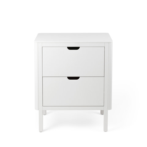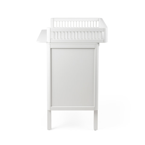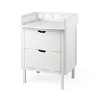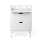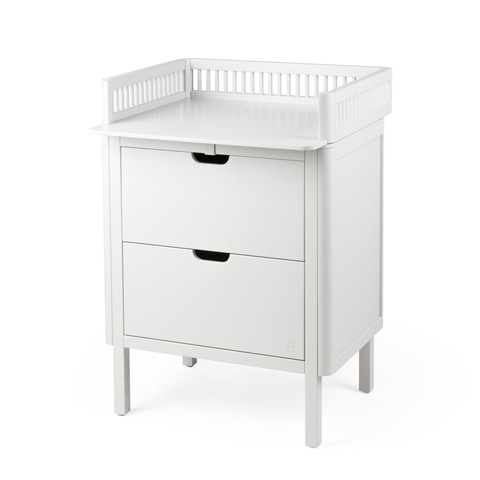 Sebras skötbord är en elegant, funktionell och danskdesignad 2-i-1-möbel som levereras med en byrå, en skötbädd och två lådor. Skötbordet har en skandinavisk och tidlös design som harmonierar med övriga möbler i Sebras klassiska möbelkollektion. Ett funktionellt, säkert och klassiskt skötbord utan oönskade kemikalier och med lång livslängd för barnrummet, sovrummet, badrummet eller någon annanstans i hemmet. Här ser du Sebra Skötbord med lådor i färgen Classic White. Sebra Skötbord med lådor är ett skötbord som enkelt kan omvandlas till en klassisk förvaringsenhet när behovet av ett skötbord inte längre finns. Skötbordet är stängt på baksidan och sidorna och har en upphöjd kant med små runda stänger, vilket ger skötbordet det karakteristiska utseende som Sebras sängar är så kända och älskade för. Skötbordet (inre mått) är 66 cm djupt och 69 cm brett, vilket ger plats för en skötbädd och andra skötartiklar som behövs för blöjbyten, klädbyten eller helt enkelt en mysig stund med ditt barn. De två lådorna ger förvaringsutrymme för kläder, blöjor, leksaker eller annat du kan behöva. Lådorna är utrustade med en mjukstängningsmekanism som gör att de stängs tyst och smidigt. Detta minimerar risken för att fingrarna fastnar, vilket är bra i ett barnrum, där små fingrar inte alltid är lika snabba som stora. Den praktiska omvandlingen från skötbord till förvaringsenhet uppnås genom att enkelt ta bort skötunderlägget från den nedre delen. Denna funktion innebär att det inte är nödvändigt att förvara ett komplett skötbord eller göra sig av med det mellan blöjbyten – eller när behovet av ett skötbord helt enkelt försvinner. Detta ger skötbordet en extra lång livslängd och skapar en produkt som kan växa med barnet eller dess syskon – en möbel som enkelt kan ärvas vidare. Fronterna har snidade handtag som tillsammans med byråns rundade hörn bidrar till ökad säkerhet i barnrummet – inga vassa kanter som kan orsaka skrapsår och skador. Skötbordet har fyra ben, vilket ger ett lättare och mindre skrymmande utseende än ett skötbord utan ben. Detta ger också förvaringsutrymme under byrån, om det behövs.