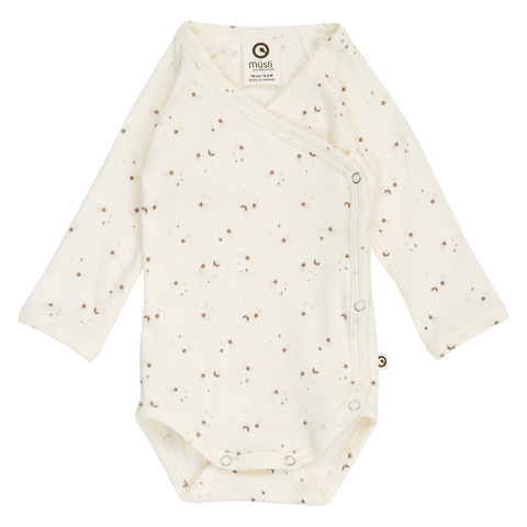 Sparkle Rib Wrap Body från Müsli är en underbart mjuk och bekväm body med omlottknäppning, perfekt för de allra minsta. Den ribbade strukturen ger extra stretch och komfort, samtidigt som den söta printen med stjärnor och månar i balsam cream, walnut och oat skapar ett lugnt och harmoniskt intryck. Omlottknäppningen gör det enkelt att klä på och av barnet, och de långa ärmarna håller små armar varma. Materialet består av 95% ekologisk bomull och 5% elastan, vilket gör bodyn både skonsam mot huden och lätt att röra sig i. Ett perfekt val för vardagens alla stunder!