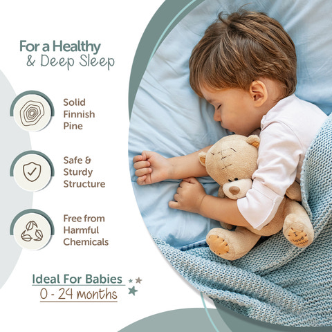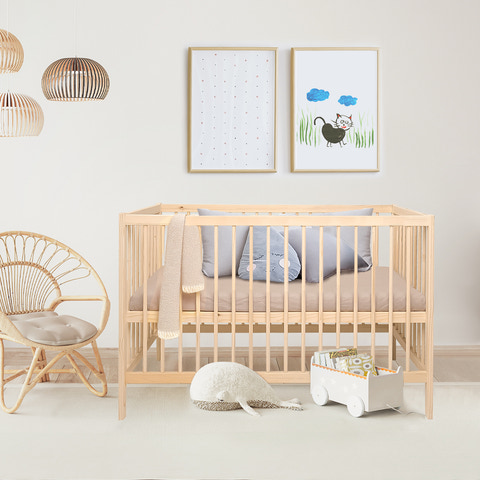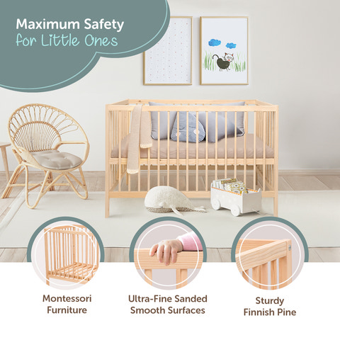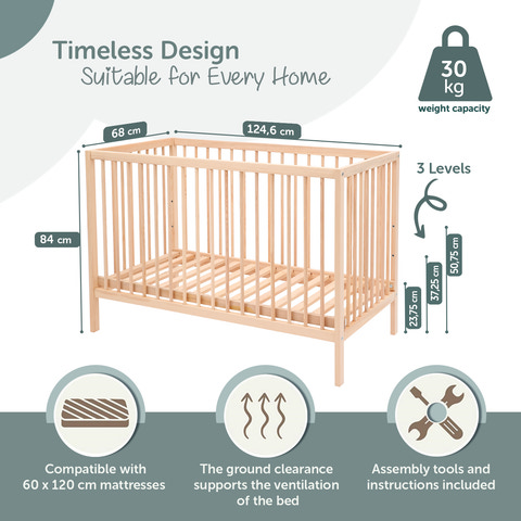 Kukka 3-stegs spjälsäng, som ger naturlighet och bekvämlighet för ditt barn och dig. Kukka 3-stegs spjälsäng växer med ditt barn och erbjuder en säker och lång livslängd med sin justerbara höjd som följer ditt barns utveckling. Den minimalistiska designen med noggrant släta ytor och högkvalitativt massivt trä utan kvistar eller splitter gör Kukka-spjälsängen perfekt för ditt barns rum.