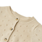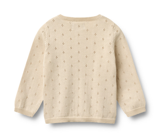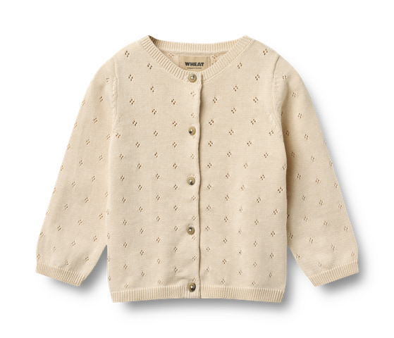Långärmad stickad kofta i mjuk ekologisk bomull för bebis.Wheats stickade plagg är en sann nödvändighet under de ständigt växlande årstiderna, eftersom de är mjuka och bekväma att bära utan någon form av klåda. Våra stickade plagg har en klassisk look med en avslappnad passform som gör det enkelt att styla med vilken outfit som helst och fungerar bra som ett varmare lager över en av våra bodys, t-shirts eller klänningar. Den är även perfekt som ett extra lager under en jacka.