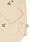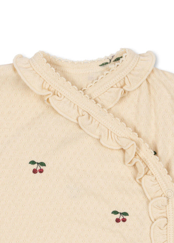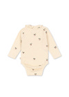 Mjuk bodysuit i bomull för nyfödda med omlottknäppning och volangdetaljer. Med tryckknappar längs kroppen och vid benöppningen, vilket gör det enkelt att klä på ditt barn.
