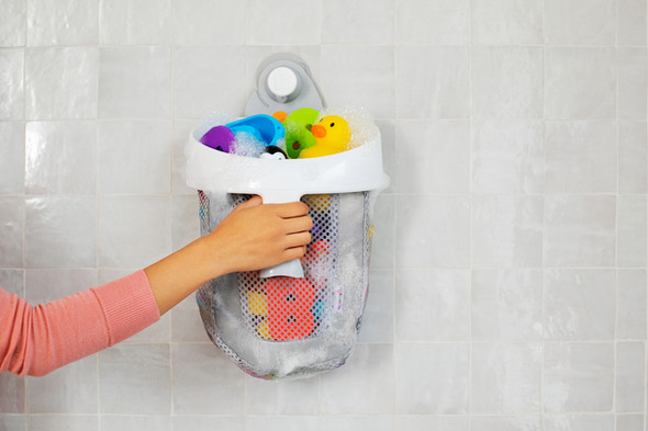 Leksaksuppsamlare i nätmaterial som gör att badleksakerna torkar snabbt. Extra stark upphängning med sugprott som fäster bra på kakel och glas.