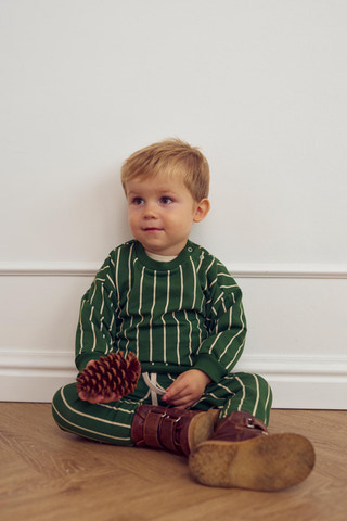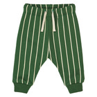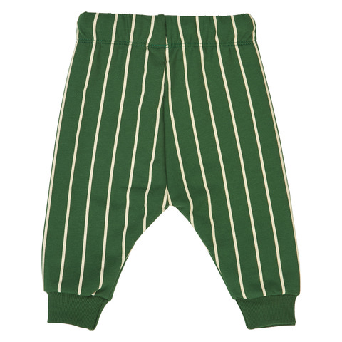 Dessa smarta sweatpants är perfekta för aktiva småbarn. De är gröna med fina, krämfärgade vertikala ränder som ger ett modernt och lekfullt uttryck. Byxorna har resår och knytband i midjan, vilket garanterar en bra och justerbar passform.