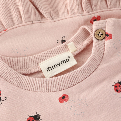 Minymo Sweatshirt med tryck – Peach Whip är en charmig och bekväm tröja för de små. Den vackra rosa färgen i kombination med ett sött nyckelpigatryck gör den perfekt både för vardagsbruk och speciella tillfällen. Tröjan är tillverkad i ett mjukt och bekvämt tyg som garanterar komfort hela dagen. Den rynkade fållen ger en feminin touch, medan ribbade muddar och halsringning garanterar en bra passform. Praktisk knäppning på axeln gör det enkelt att ta på och av tröjan, vilket är perfekt för både barn och föräldrar. Perfekt för att skapa en mysig och söt look.